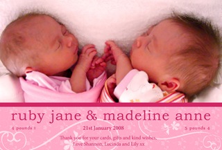 I've been lucky enough to work for new mum of twins, Ellie, on the two designs above. Going through the photos of her gorgeous little girls I almost felt clucky again!