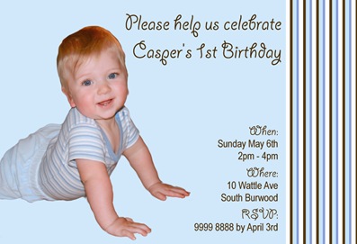 Its not long until I have to start designing my own boys' first birthday invitations, and in the mean time I'm kept busy with all these gorgeous babies turning 1. This is Casper's invitation- a lovely baby blue creation with chocolate brown accents, just what his mummy requested!
